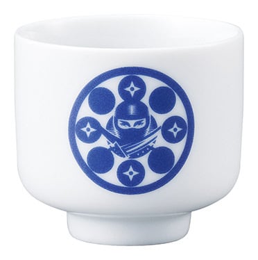 忍びの武器である手裏剣と刀を配置。エッジの効いたモダンなグラフィックが、白磁の盃に美しく映えます。