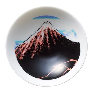 江戸時代の浮世絵師・葛飾北斎の代表作「富嶽三十六景」より、「凱風快晴」「神奈川沖浪裏」「山下白雨」の3作品をぐい呑みの内底に配したデザイン。常温では墨絵調のシンプルな線画が見え、冷酒を注ぐと徐々に色が浮かび上がる特殊な温感技術が使われています。