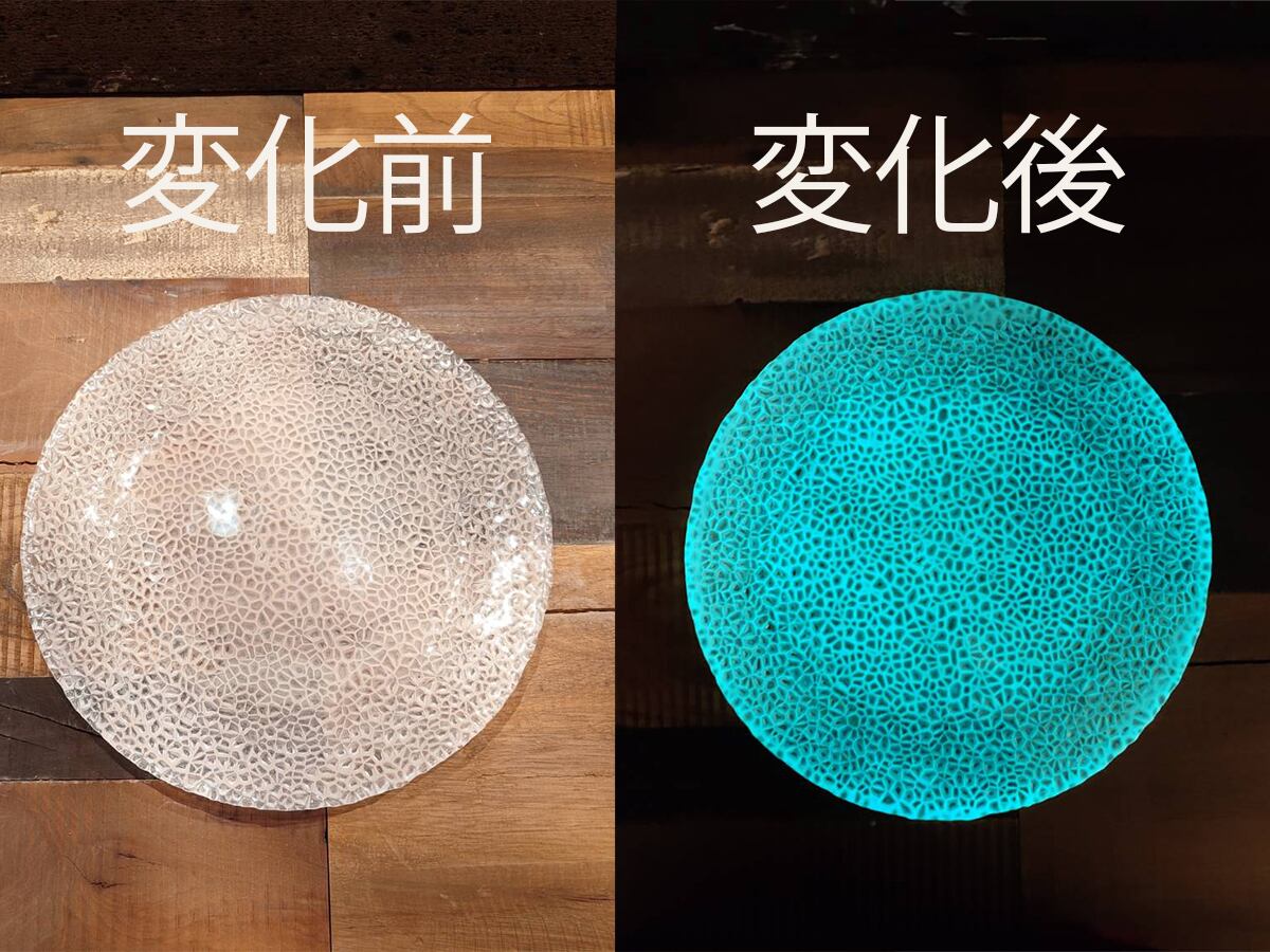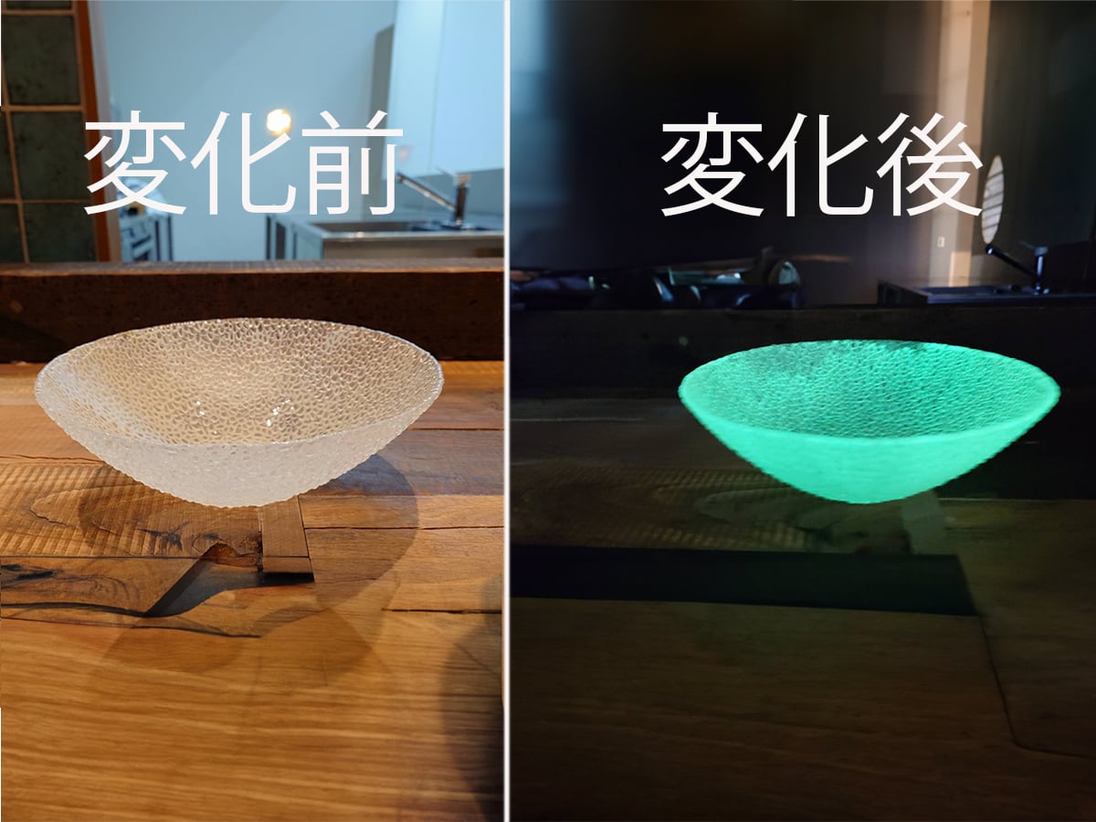 日中や照明下では透明感のあるガラス食器としてお料理を美しく引き立て、蛍光灯やLEDなどの光を吸収した後に灯りを消すと、器全体がやわらかく光を放ちます。