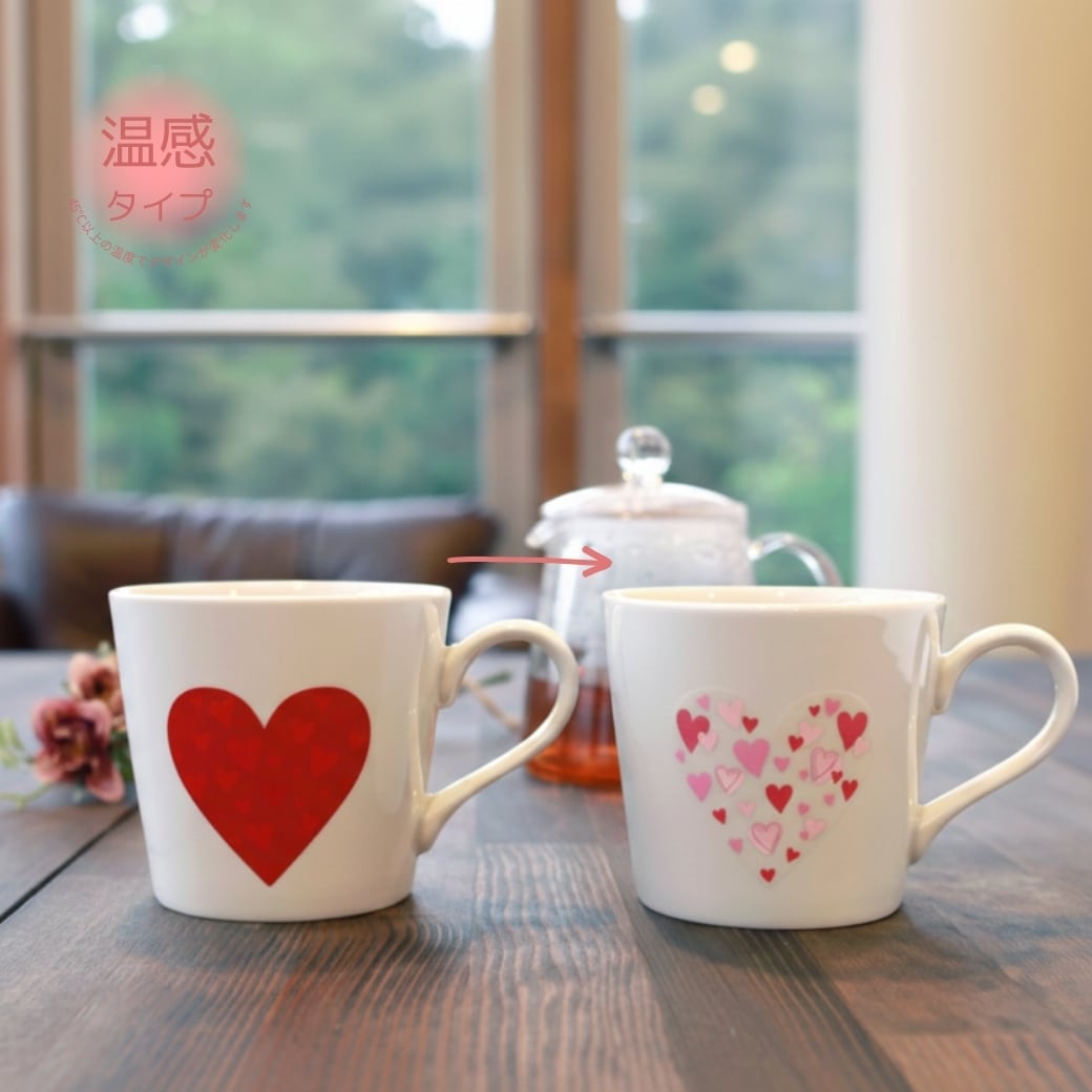 「ハートで包まれるマグカップ」と「ハートで包まれる耐熱ガラスマグカップ」をセットにした、