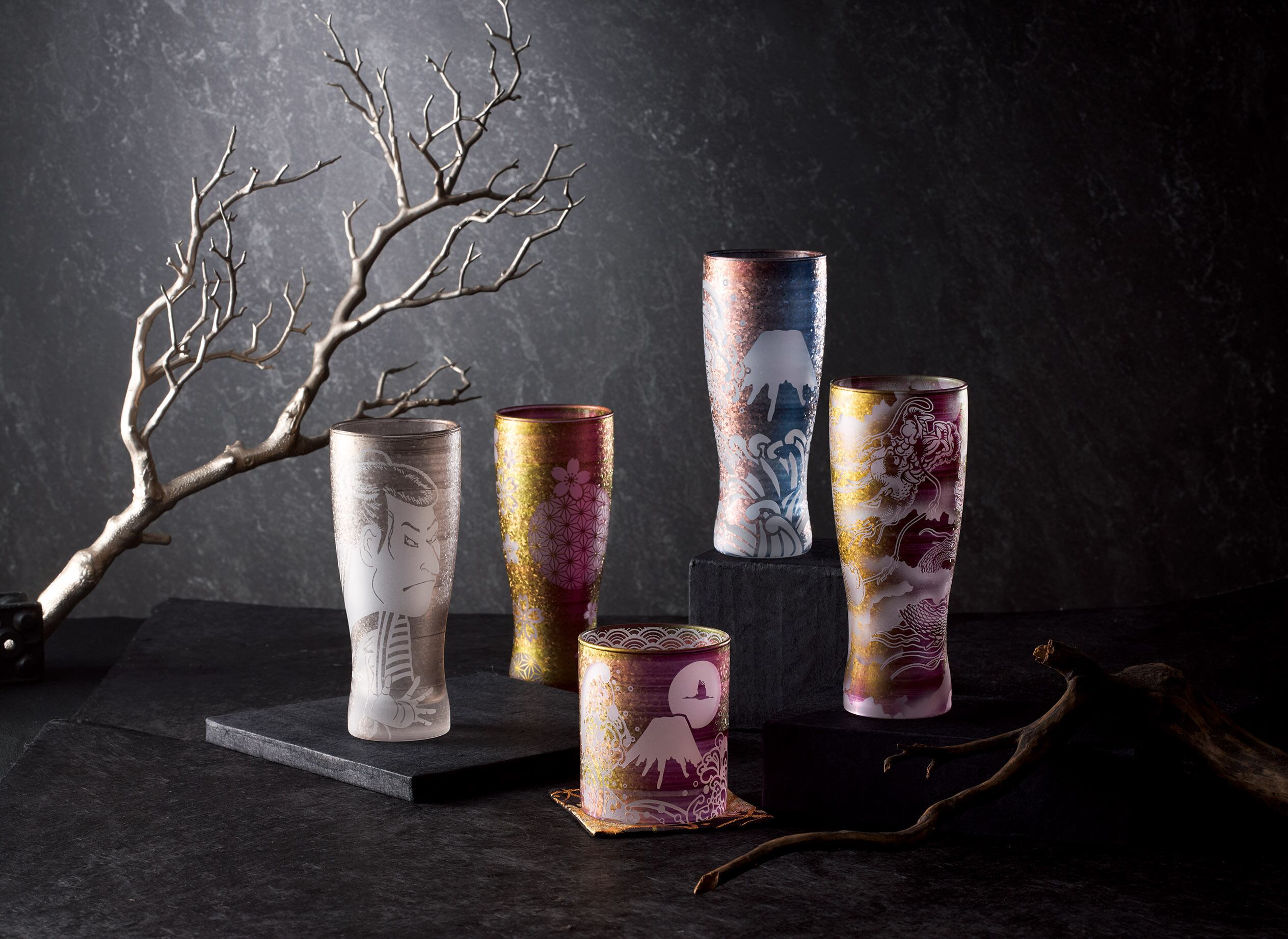 このグラスは外側表面にインフロスト(結晶状の模様をグラス本体に閉じ込める特殊加工)を施し、さらに筆を使って金銀銅の顔料を塗装した後、焼成して仕上げました。