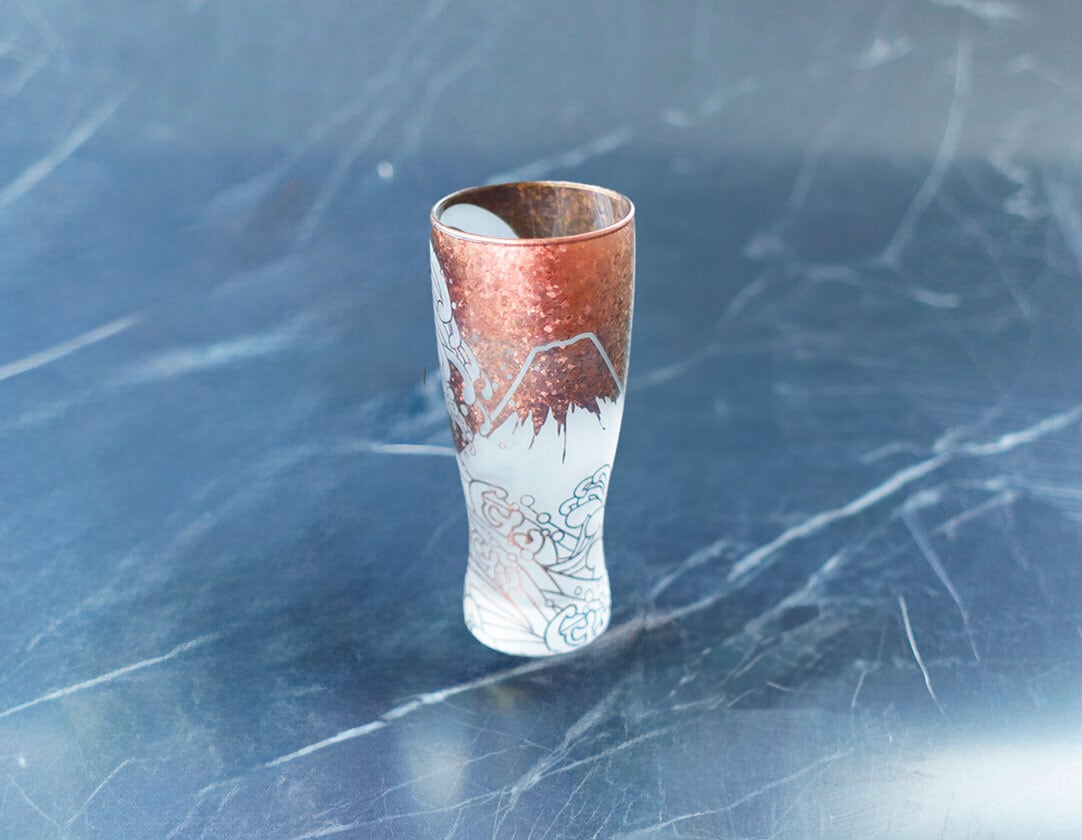 このグラスは外側表面にインフロスト(結晶状の模様をグラス本体に閉じ込める特殊加工)を施し、さらに筆を使って金銀銅の顔料を塗装した後、焼成して仕上げました。通常時も美しく輝くタンブラーですが、グラス本体に光を当てると内側の色が美しく変化します。
