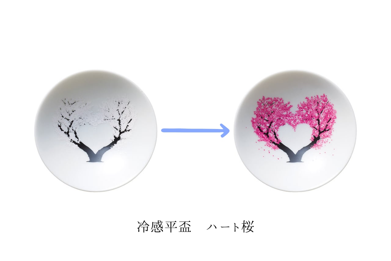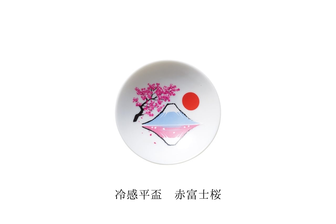 冷たい飲み物を注ぐと、器が17℃以下になった時に内側の絵柄が鮮やかに浮かび上がる「冷感平盃シリーズ」です。日本酒にぴったりのサイズ感で、使うたびに驚きと華やかさを楽しめます。